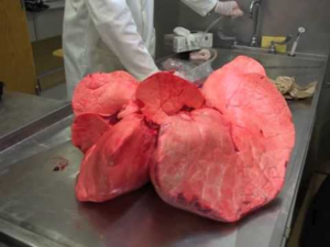 And so, the lungs are checked for adhesions. First, the bodek opens the diaphragm to pass his hand over the lung’s various lobes, to gauge proper formation, and the presence of any adhesions. He removes the lungs entirely from the cavity and examines them externally, as well.