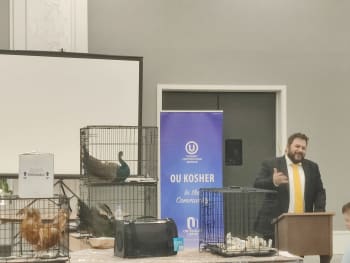 OU Kosher Rabbinic Coordinator Rabbi Chaim Loike teaches about what makes birds kosher with a live bird demonstration at an OU Kosher in the Community event in Houston, Texas