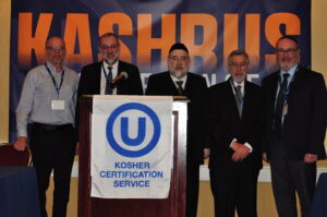 L to R at the OU Kosher Kashrus Conference: OU Kosher Chairman Dr. Joshua Penn; OU Kosher Vice Chairman Rabbi Yosi Heber; OU Kosher COO Rabbi Moshe Elefant; OU Kosher CEO Rabbi Menachem Genack; OU Kosher CEO Rabbi Menachem Genack; and OU President Mitchel Aeder