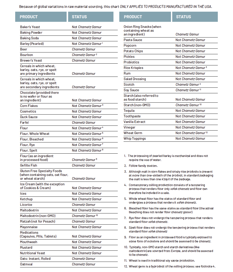 The foods listed in the chart on page 39 are identified either as chametz gamur and, according to the stringent position, should not be included in a sale, or “not chametz gamur,” and may be included in a sale.