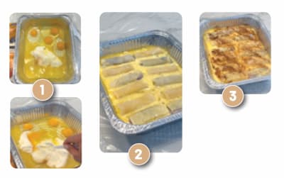 Blintz souffle is a delicious dairy delight that is semi-homemade and comes together in minutes. Premade kosher for Pesach blintzes can be found in the frozen section of most kosher markets. Everything will be prepped in an aluminum 9×13 pan, using either disposable measuring cups or even a standard plastic cup, as measurements don’t have to be exact. A plastic spoon will work in place of a tablespoon.